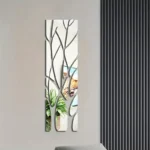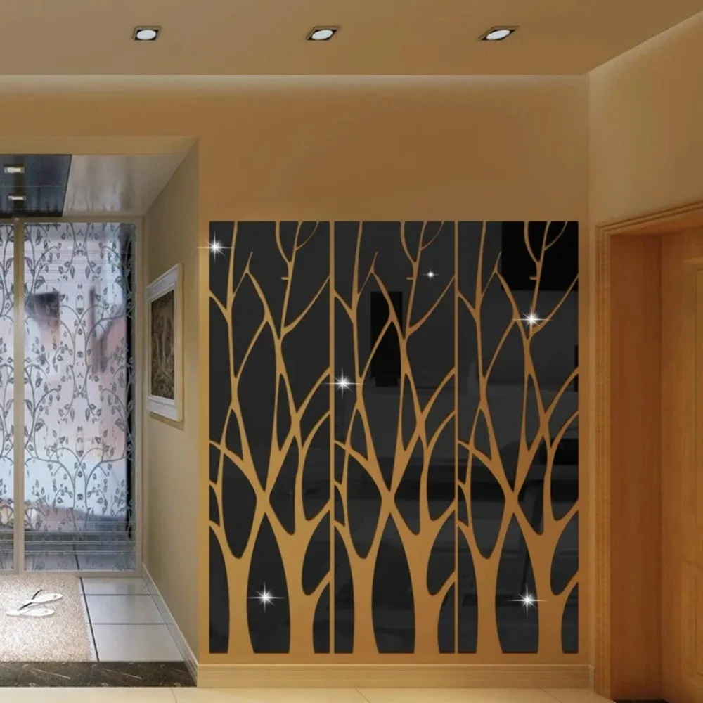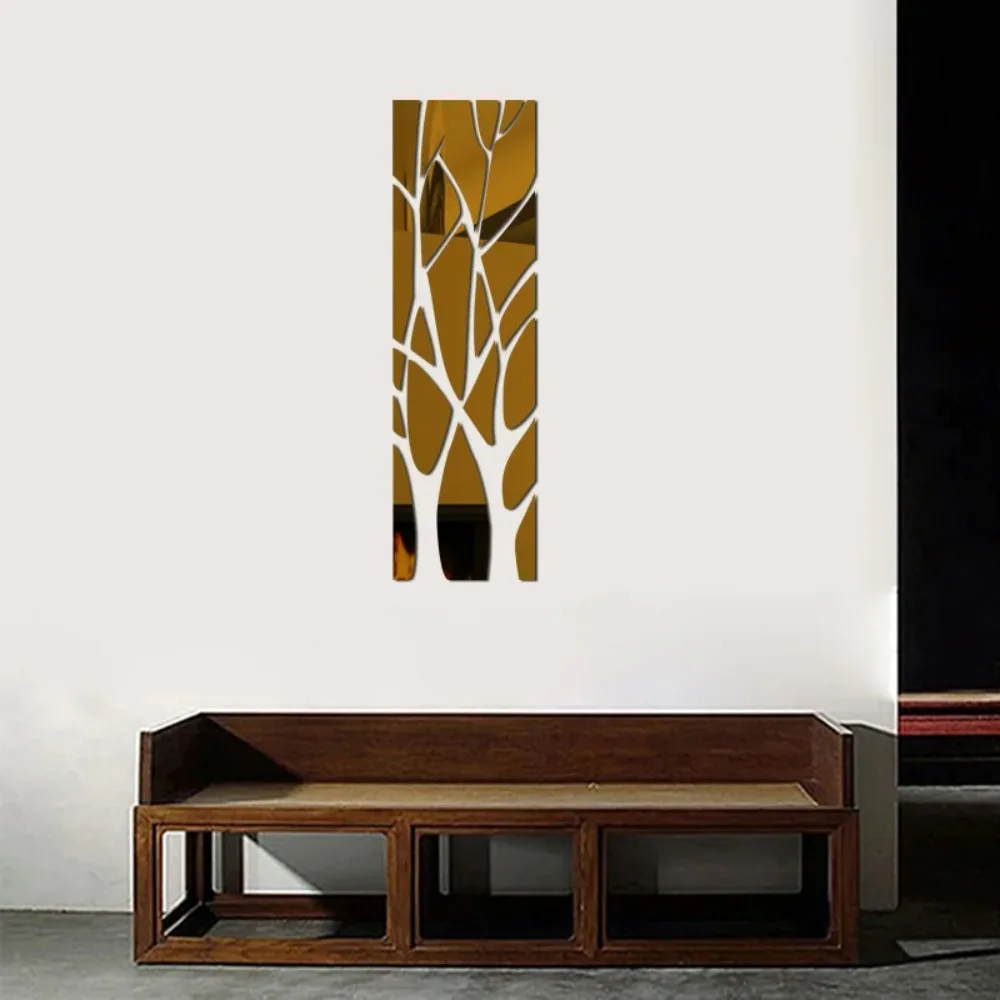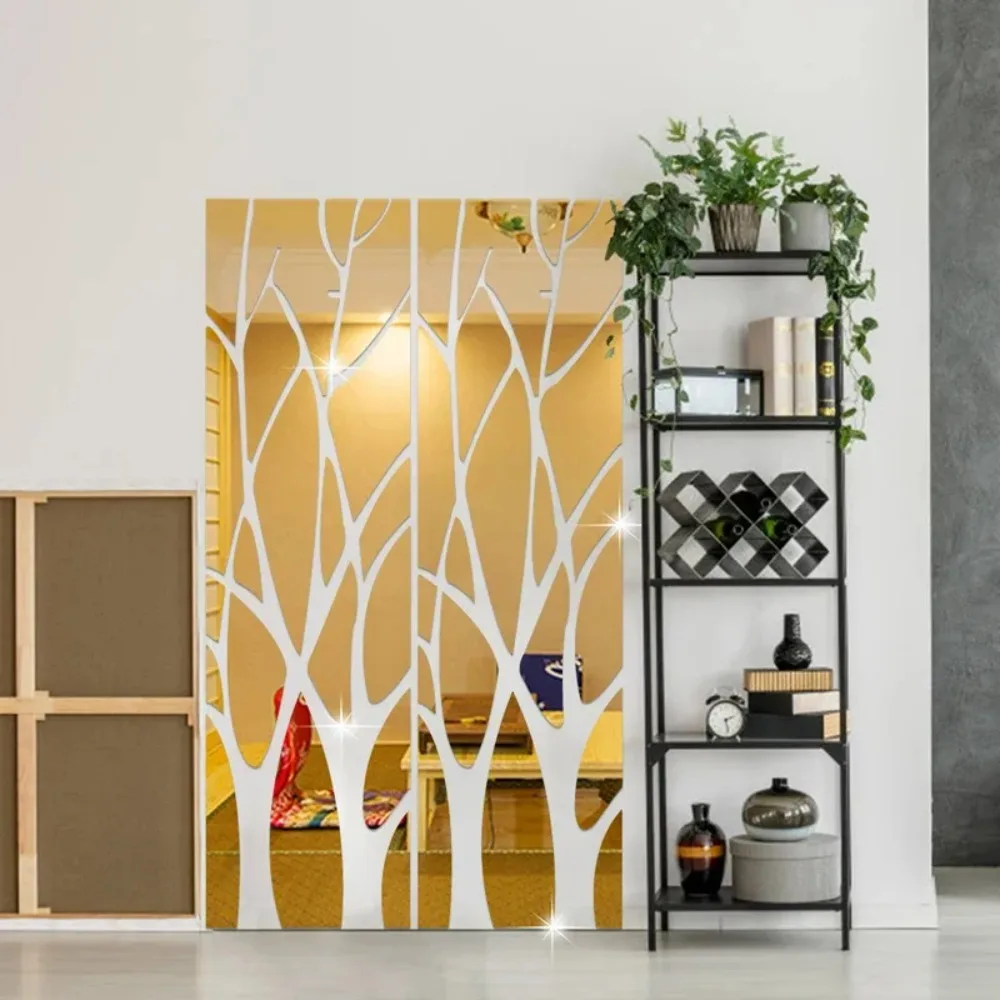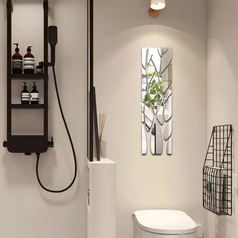 2. ملصق الحائط المرآة يُعطي وهمًا بمساحة أكبر، والانعكاس المشوه قليلاً يُضفي لمسة مرحة.